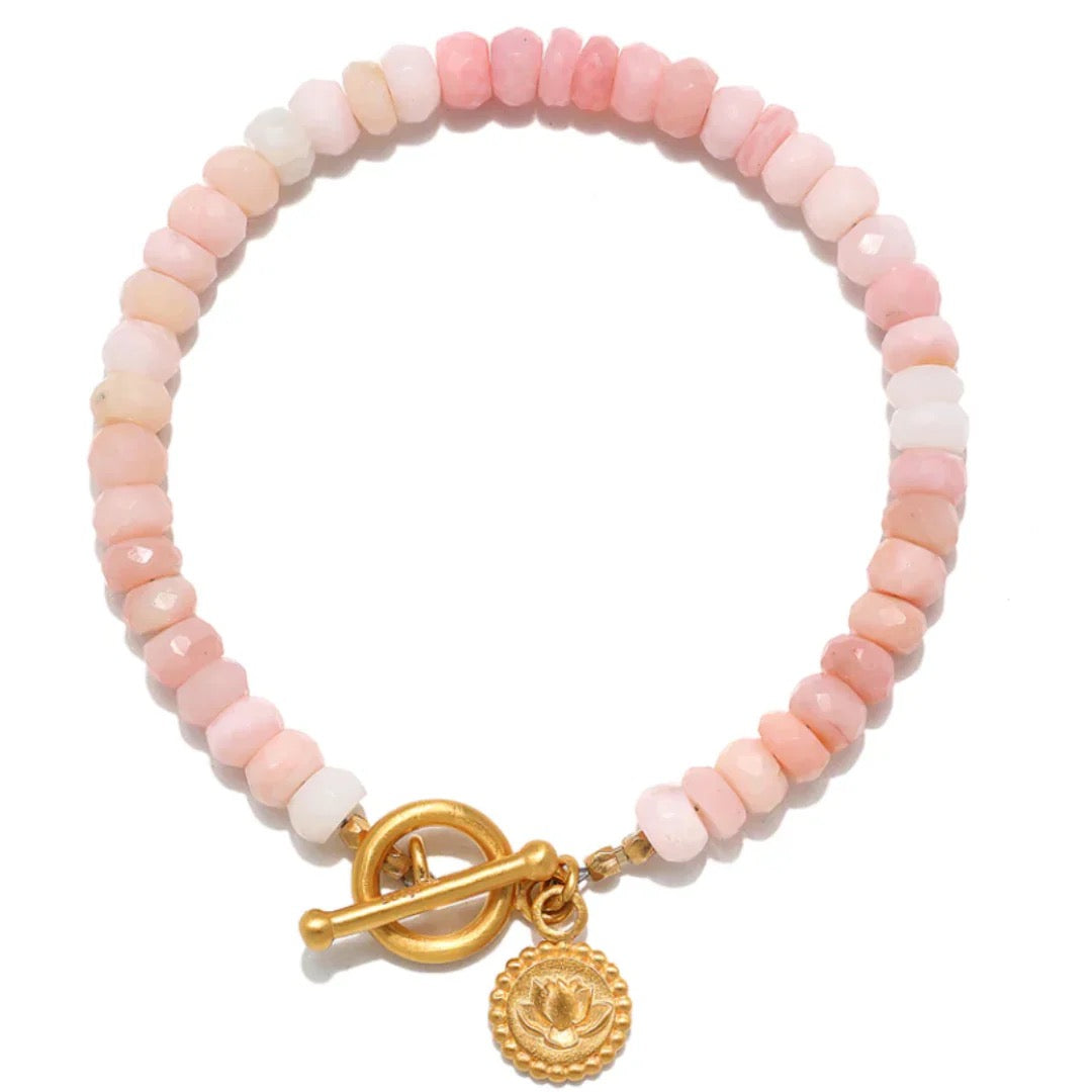 This pink opal beaded toggle bracelet promotes inner peace and spiritual healing! Featuring an 18kt gold charm, engraved with a lotus flower that symbolizes new beginnings and infinite potential, perfect for inspiring a fresh start.