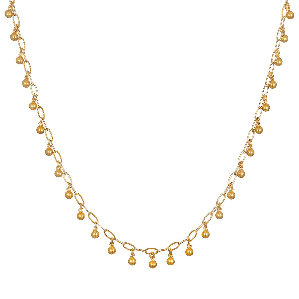 Joy arrives on the whisper of a breeze. An 18KT gold plate choker necklace features delicate round balls that dance on the skin. Wear this adjustable choker necklace alone, or as part of your unique layered look.